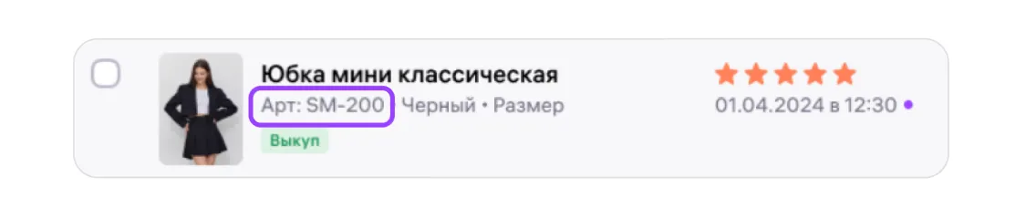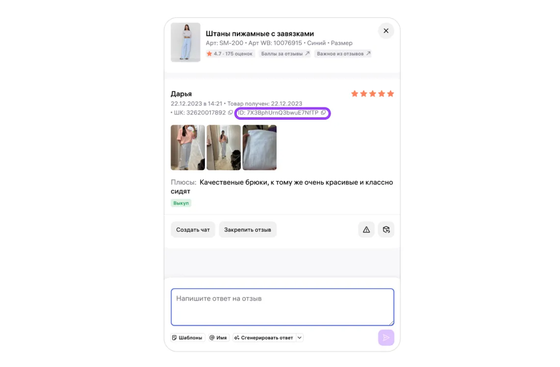 Для каждого отзыва покажем дату выкупа товара, его вариант или цвет, ШК заказа и статус. Если покупатель выбрал достоинства или недостатки товара из готового списка, покажем их в столбце с отзывом: