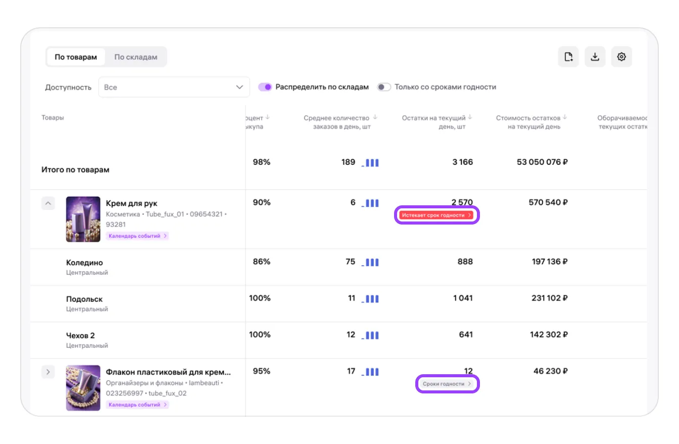 — детализацию по каждому складу — сколько единиц хранится и к какому периоду срока годности они относятся.