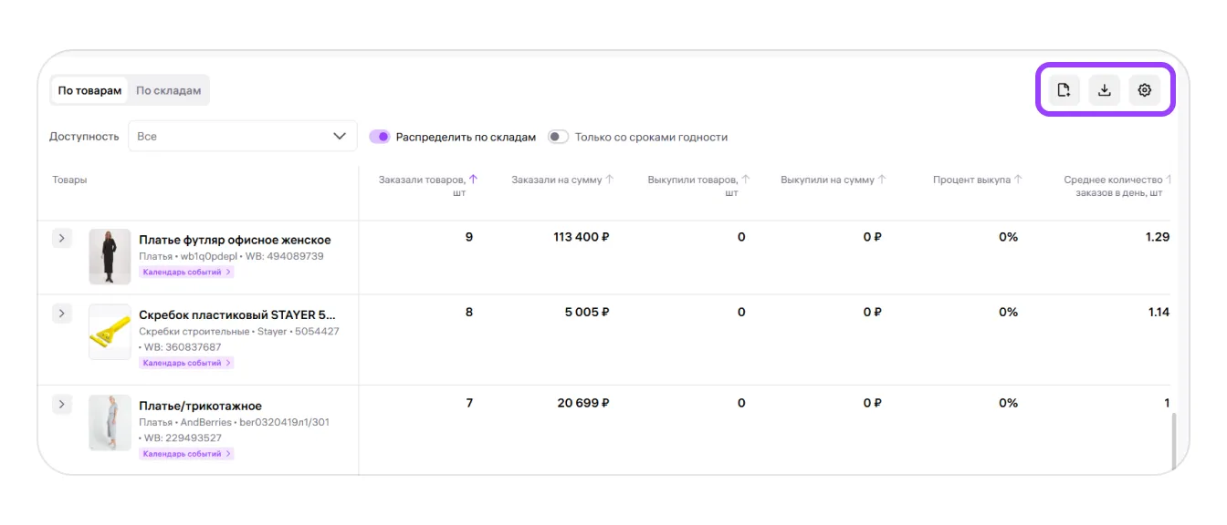 — «По товарам» группирует информацию по всем артикулам ваших товаров. Вы увидите данные по каждому артикулу отдельно: тип доступности, сколько заказов артикула было и сколько выкупов. Если включите «Распределить по складам», можно посмотреть, какие размеры товара есть на складах и в каком количестве;