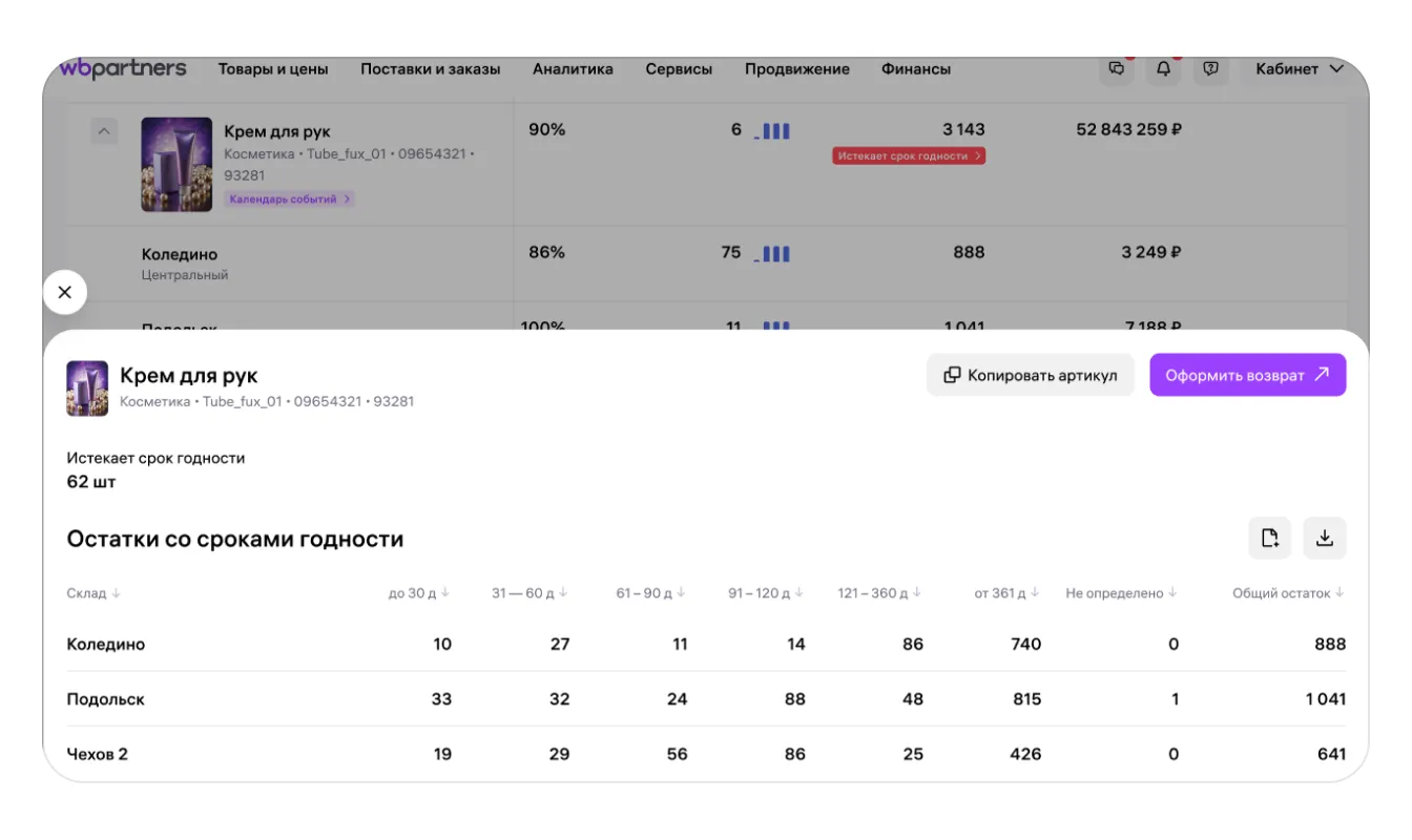 Здесь же есть кнопка копирования артикула, чтобы быстро использовать его, например, в разделе поставок, и переход в раздел возвратов — можно вернуть товары с истекающим сроком годности со склада.