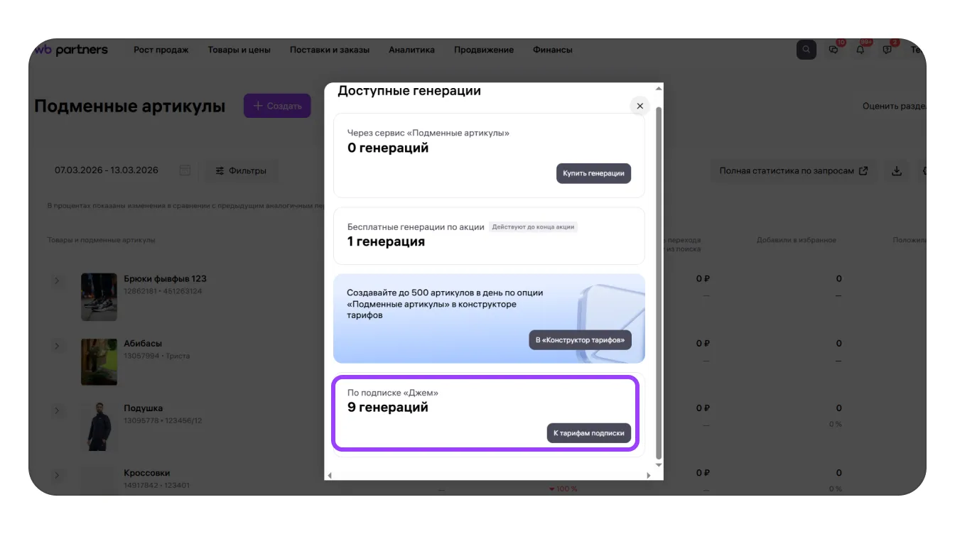 2. Вы увидите, сколько генераций артикулов по подписке «Джем» осталось.