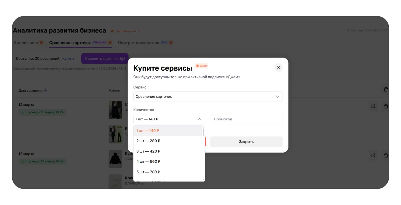 Чтобы докупить лимиты, перейдите в главном меню портала Аналитика → Аналитика развития бизнеса → вкладка «Сравнение карточек».