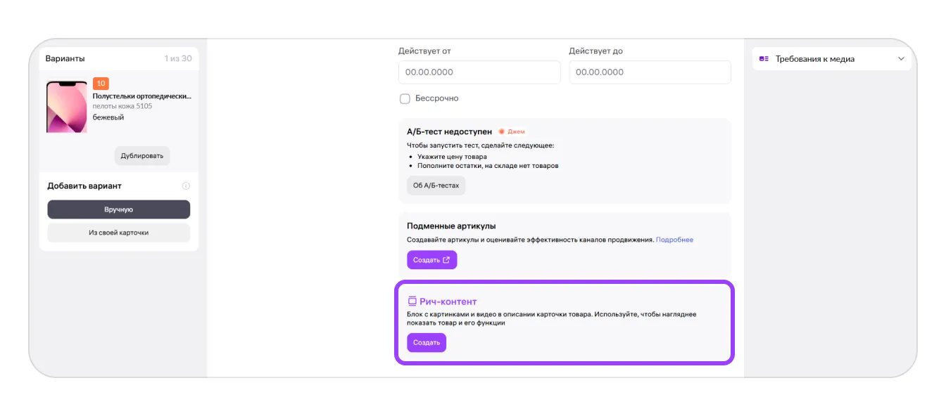 Рич-контент — это блоки с текстами, иллюстрациями и видео в карточке товара. С его помощью можно рассказать о преимуществах товара или продемонстрировать, как им пользоваться. Чтобы увеличить доступное количество генераций: