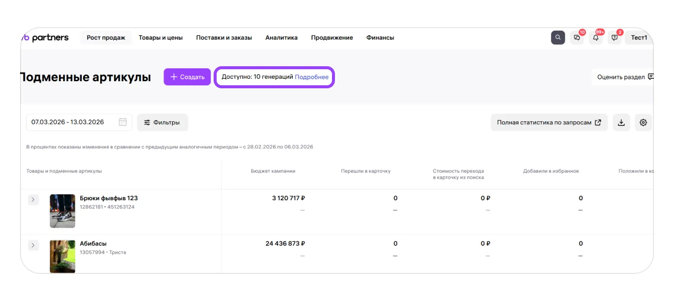 1. Чтобы проверить, сколько у вас лимитов, и докупить, перейдите: Рост продаж → Подменные артикулы. Нажмите «Подробнее».