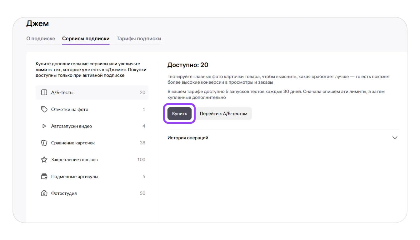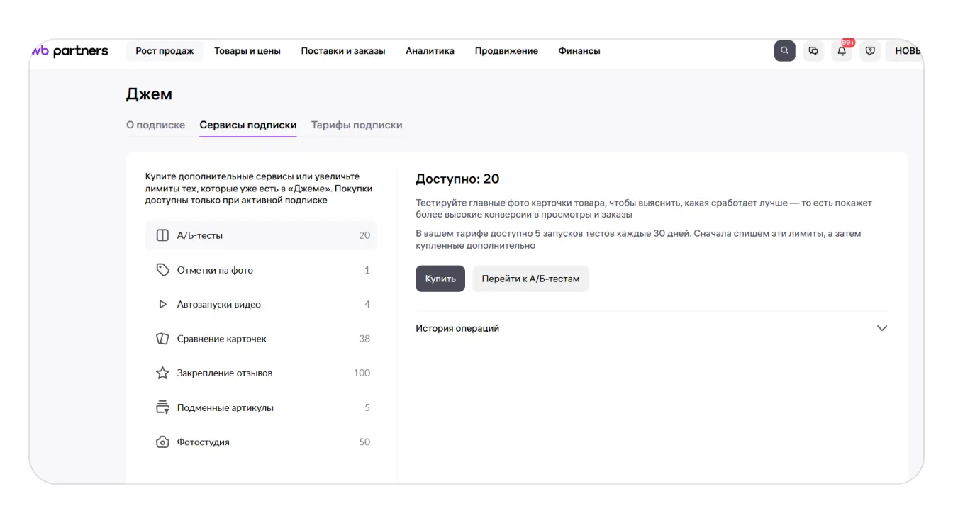 1. Перейдите Рост продаж → Подписка «Джем». Откройте вкладку «Сервисы подписки». Вы увидите список сервисов и сколько неиспользованных лимитов у вас осталось.