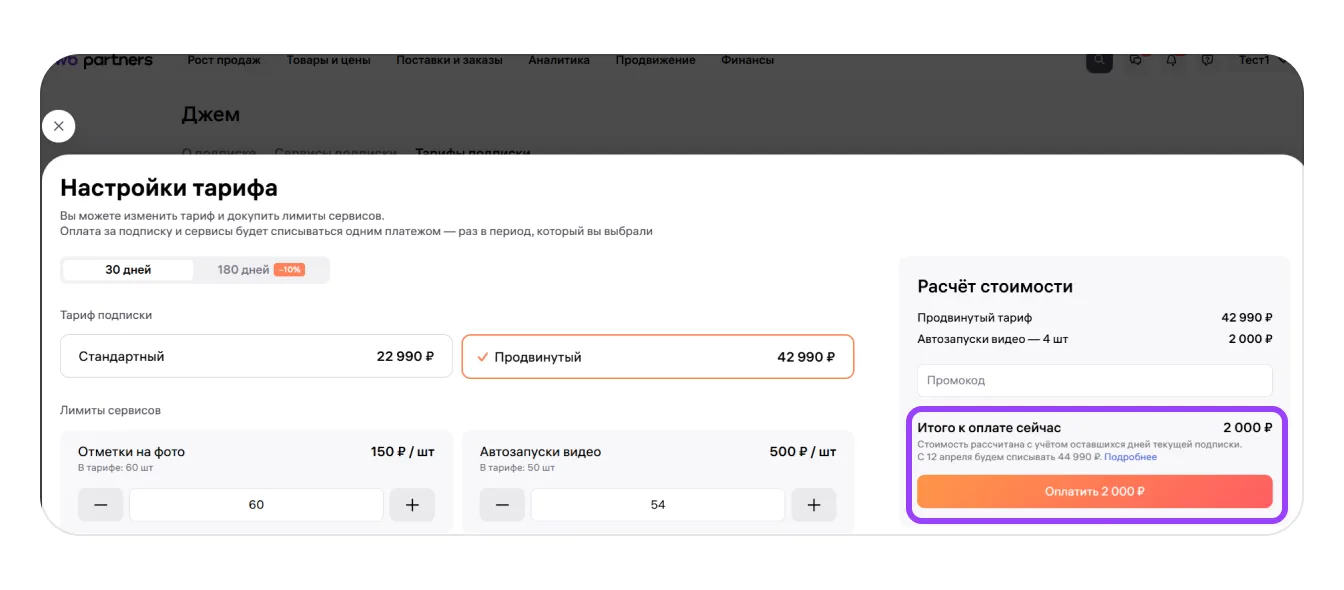 Если вы добавляете лимиты в середине срока подписки, с баланса спишется сумма только за их использование до конца текущего оплаченного периода подписки. При следующем списании оплаты подписки стоимость добавленных лимитов будет автоматически включена в стоимость тарифа и будет списываться вместе с оплатой подписки.