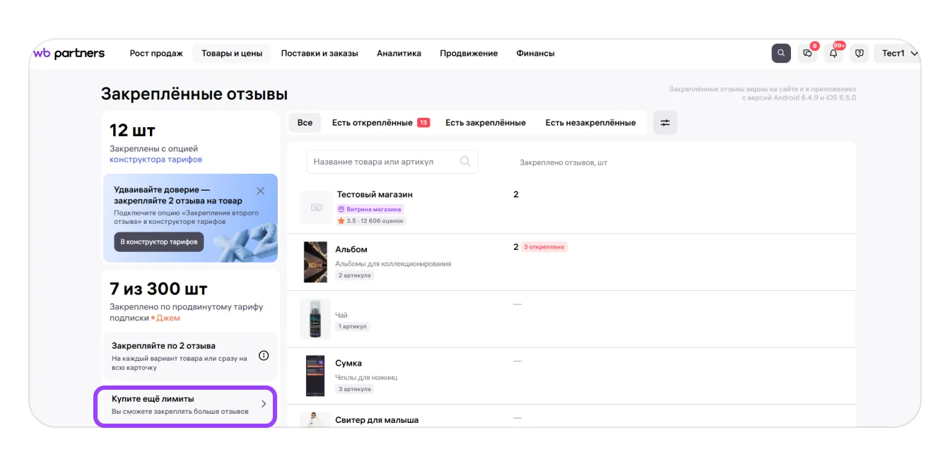 Чтобы докупить лимиты, перейдите Товары и цены → Закреплённые отзывы и нажмите «Купить ещё лимиты»