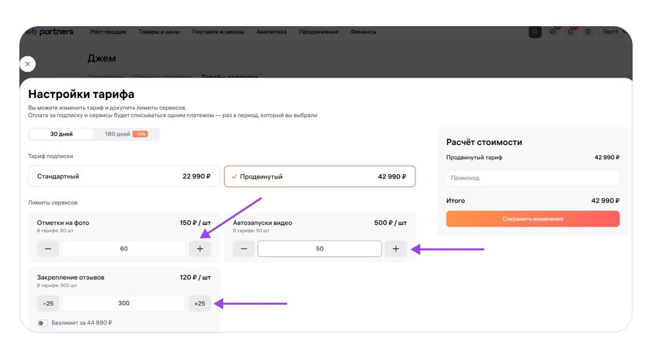 В подписку «Джем» входят разные сервисы для аналитики и работы с карточками товаров. У каждого сервиса есть лимиты использования на период действия тарифа. Их количество зависит от выбранного тарифа.