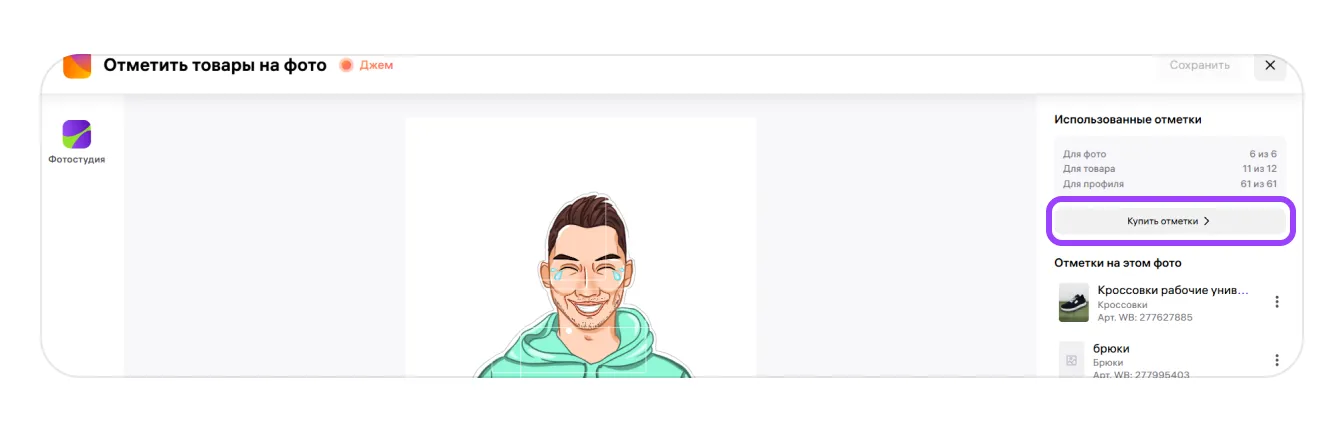 2. В новой вкладке откроется меню отметок на фото. Выберите в правом верхнем углу «Купить отметки».