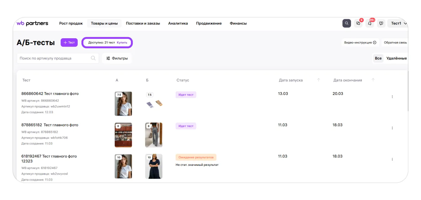 Чтобы докупить лимиты на А/Б-тестирование, перейдите в главном меню Товары и цены → А/Б-тесты и нажмите «Купить».