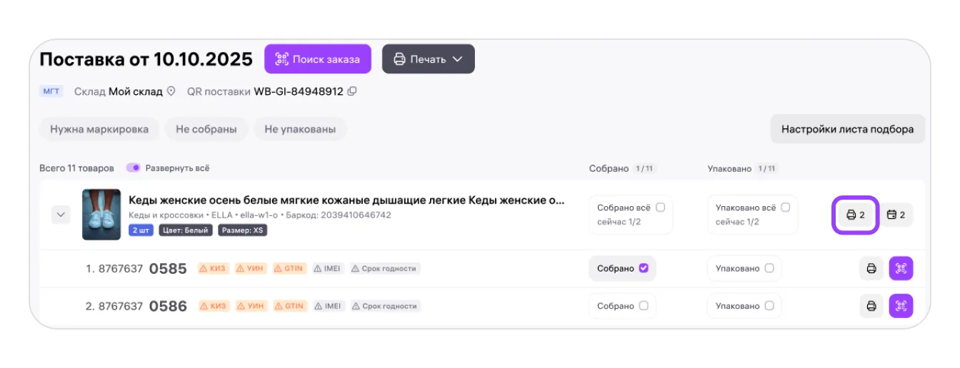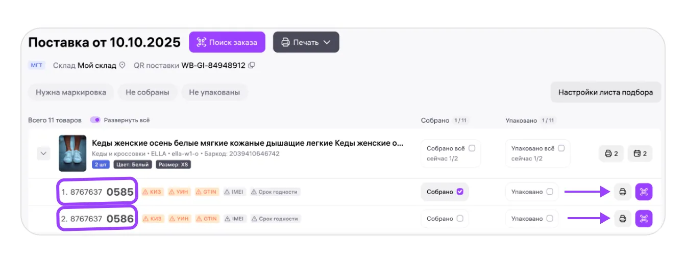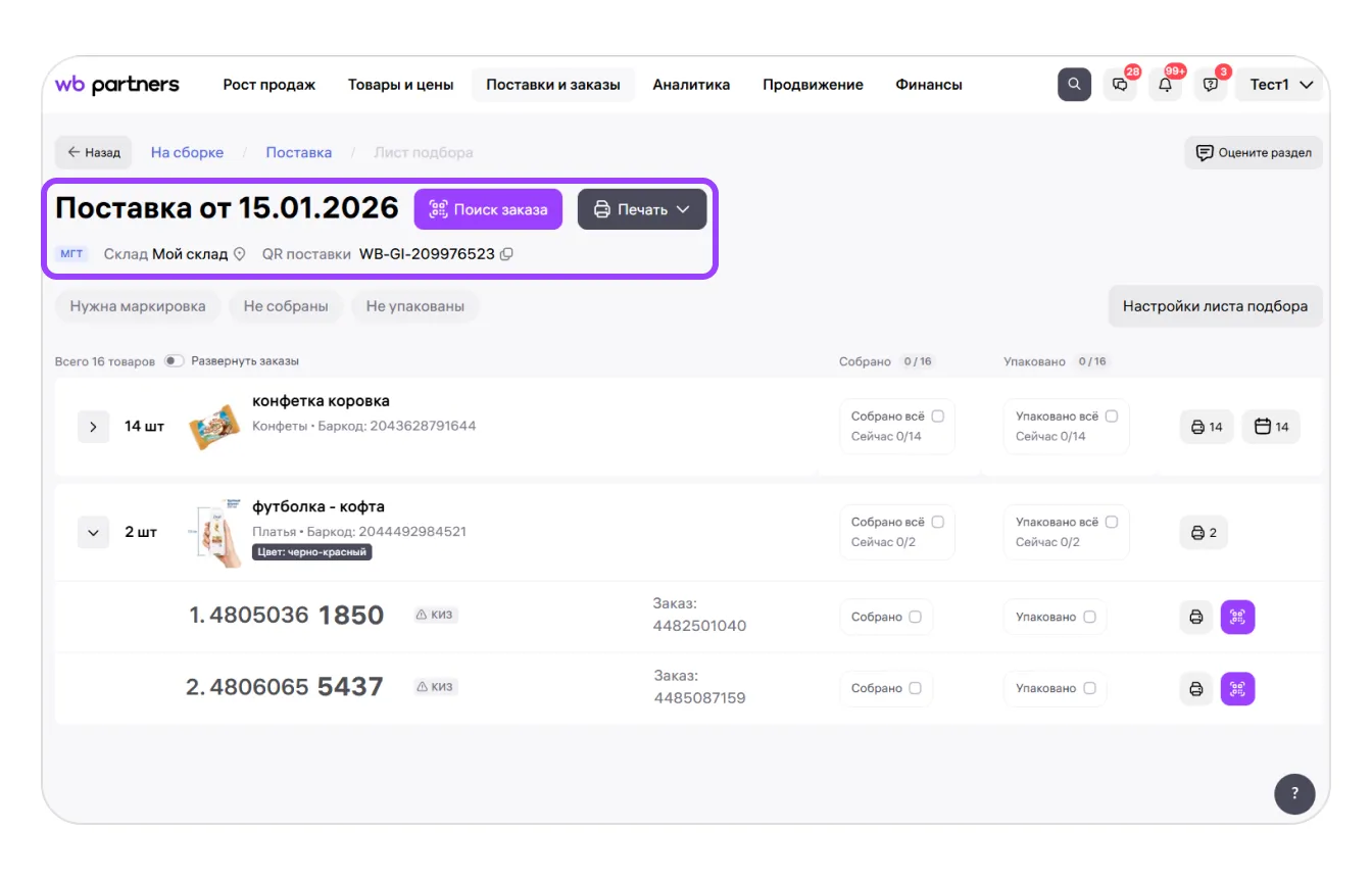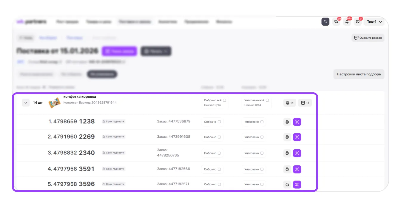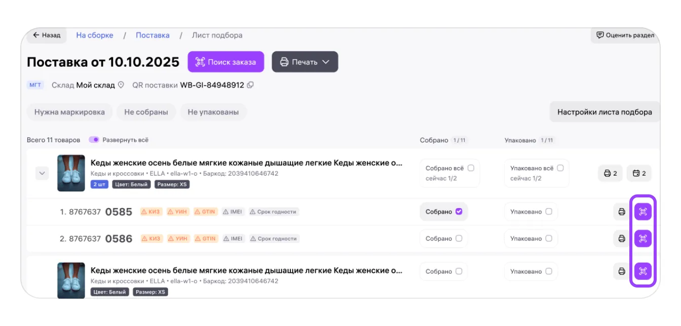 Через лист подбора вы можете добавлять коды маркировки прямо во время сборки заказов, а также вносить информацию о сроках годности для товаров в поставке.