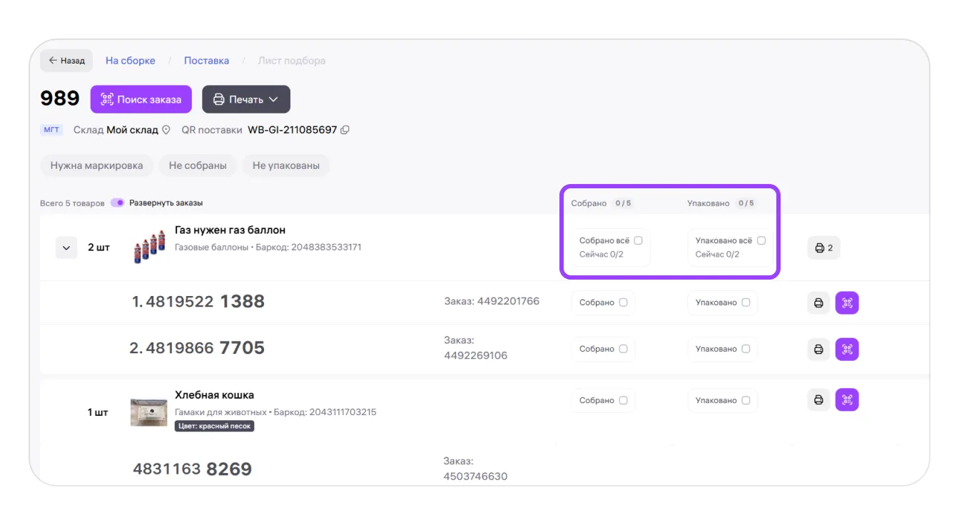 В верхней части листа — счётчики собранных и упакованных товаров. Они обновляются по мере проставления галочек и учитывают выбранные фильтры. Например, при включённом фильтре «Не собраны» счётчик показывает прогресс только по тем товарам, которые ещё не были собраны. Так проще понять, сколько позиций осталось собрать или упаковать.