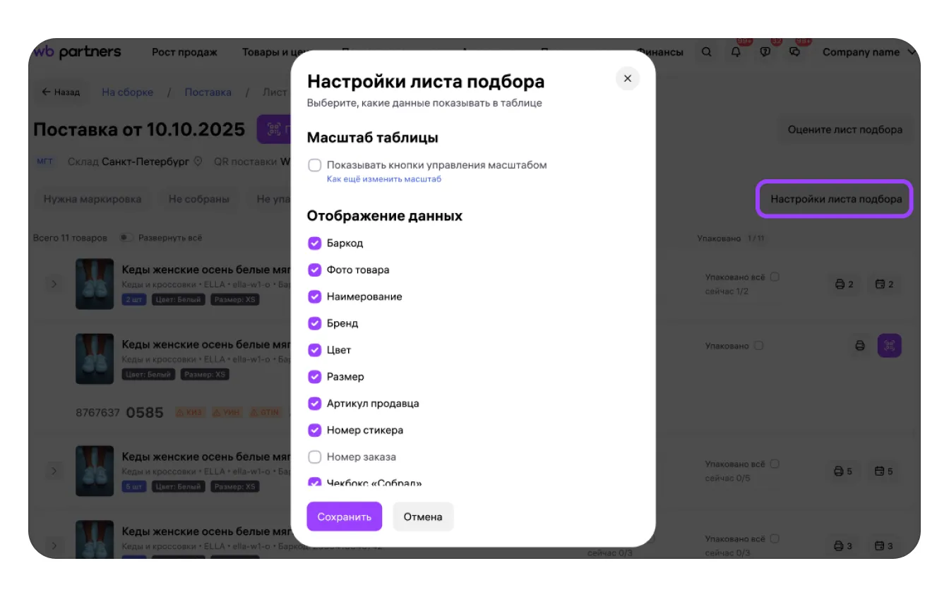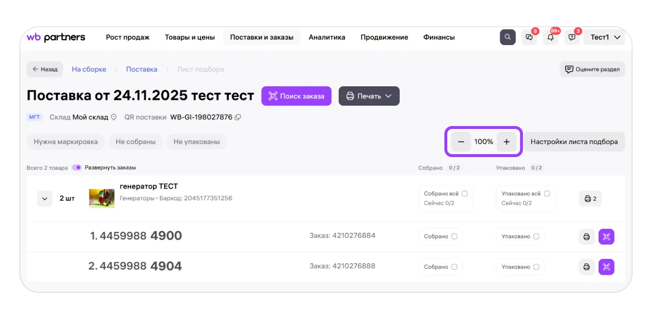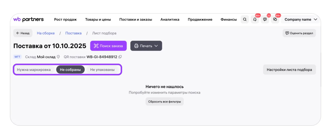 Лист подбора поможет вам быстрее собирать заказы по модели FBS. Информация обо всех товарах в поставке показана на листе в удобном для сборки виде.