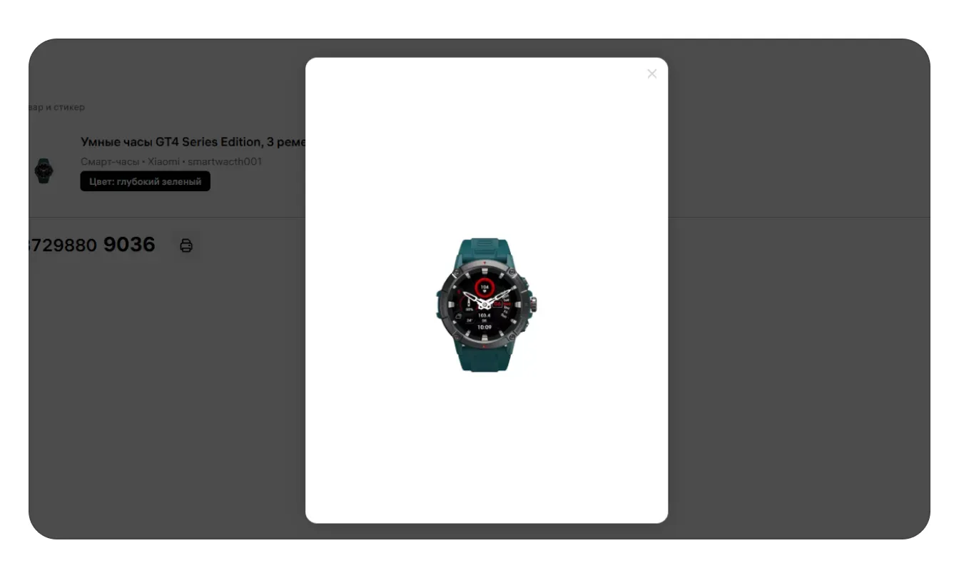 Фото на строке тоже кликабельно: по клику открывается увеличенное изображение товара: