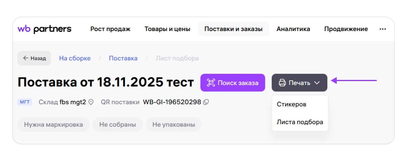 Если хотите распечатать все стикеры для товаров в поставке разом, рядом с датой поставки нажмите «Печать» и выберите «Стикеров».