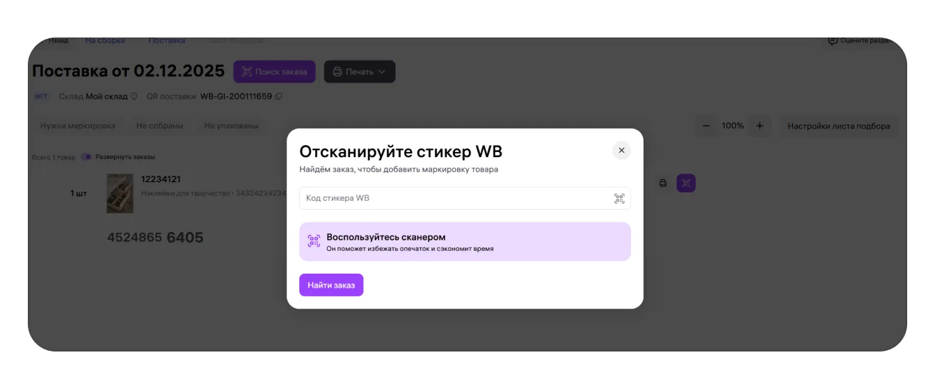2. Нажмите «Поиск заказа» рядом с датой поставки и отсканируйте стикер WB на товаре.