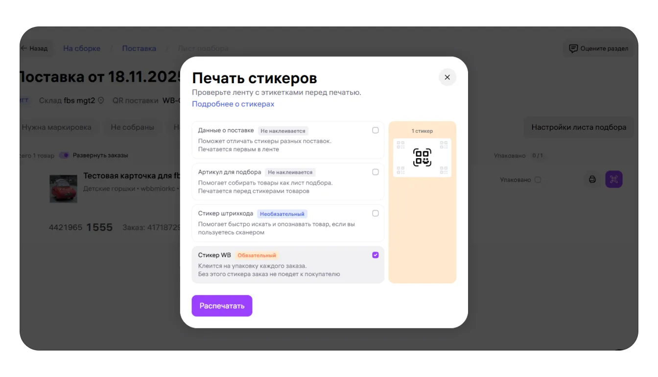 Система предложит вам распечатать все стикеры для маркировки заказа. Подробнее о том, какая вообще нужно маркировка для FBS-заказов, читайте в этой инструкции.