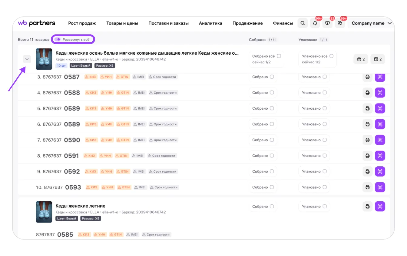 Если товаров в поставке много и лист получился очень длинный, для удобства можно отключить переключатель «Развернуть товары» над списком товаров. Так вы будете видеть только нужные карточки товаров и количество каждого товара, который нужно собрать. Это ускорит работу.