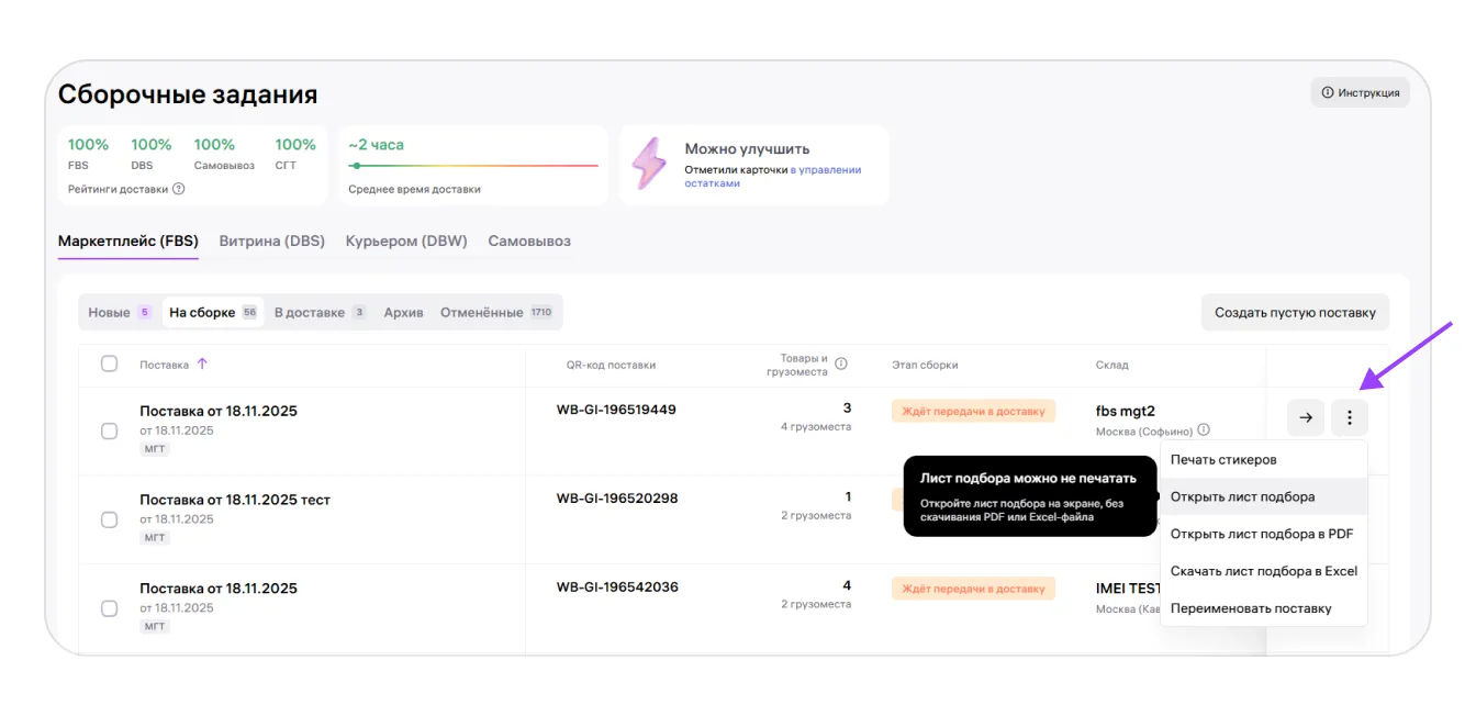 1. На вкладке «На сборке» нажать на три точки напротив выбранной поставки, затем выбрать «Открыть лист подбора».