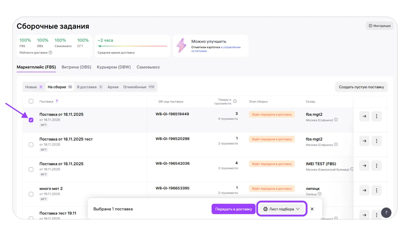 2. На вкладке «На сборке» отметить галочкой нужную поставку, в нижнем меню выбрать «Лист подбора».
