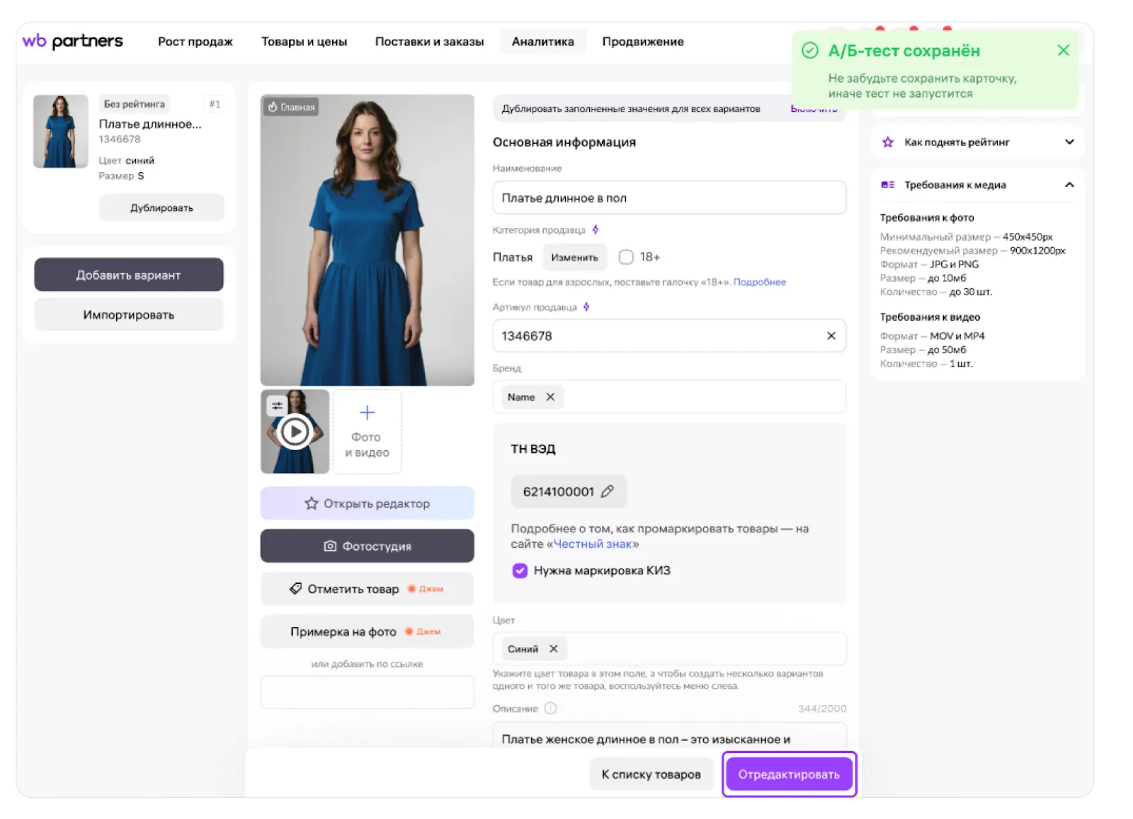 Если вы замените главное фото в карточке, система автоматически предложит запустить А/Б-тест через сервис «А/Б-тестирование главного фото в карточке товара». Сможете проверить, какое фото принесёт больше просмотров и заказов — новое или предыдущее.