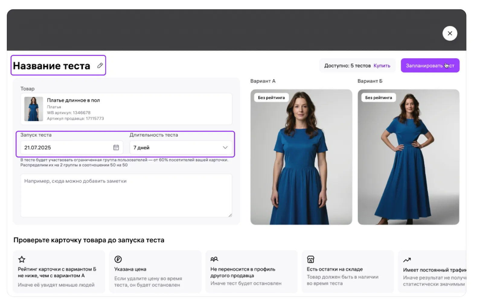 Нажмите «Создать тест». Откроется форма создания теста с двумя фото: вариант А — ваше новое фото, вариант Б — фото, которое вы заменили. Укажите название теста, дату запуска и длительность. Нажмите «Запланировать тест».