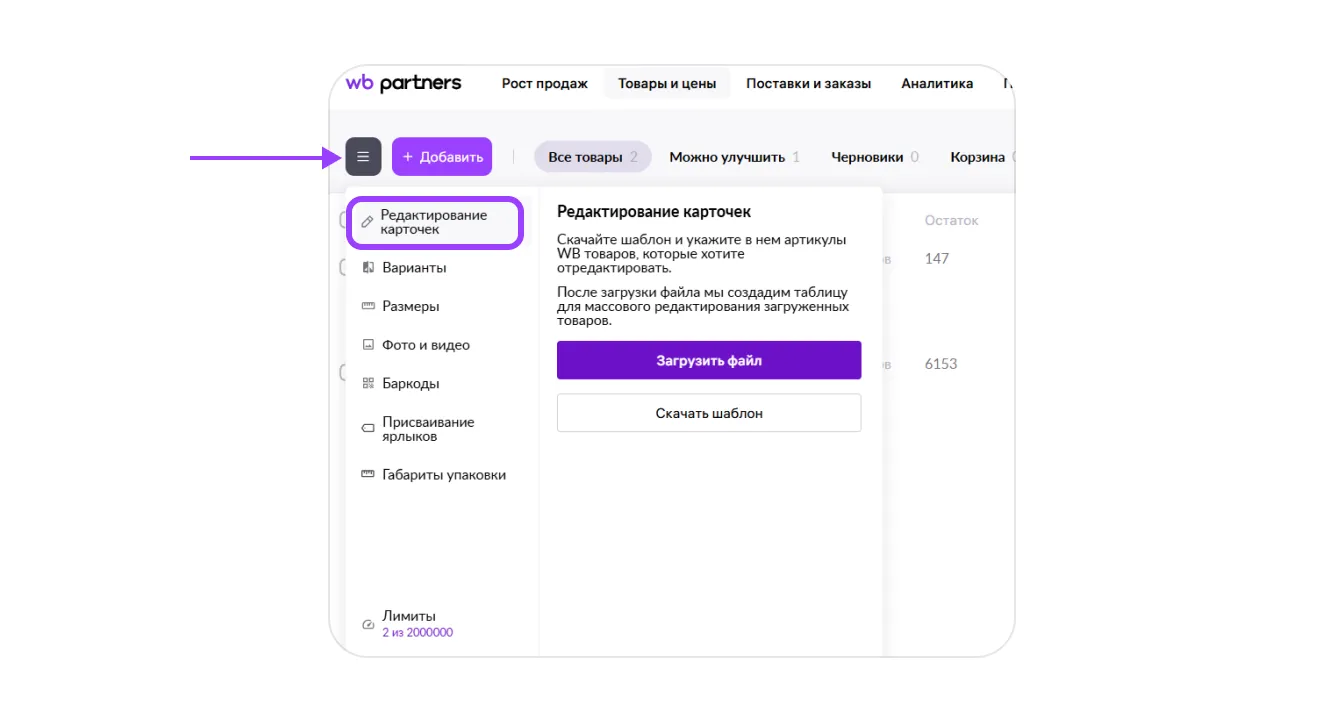 Также вы можете выбрать «Редактирование карточек», чтобы загрузить товары с помощью XSLX-шаблона. Для этого нажмите на кнопку с тремя горизонтальными полосами и выберите нужный пункт: