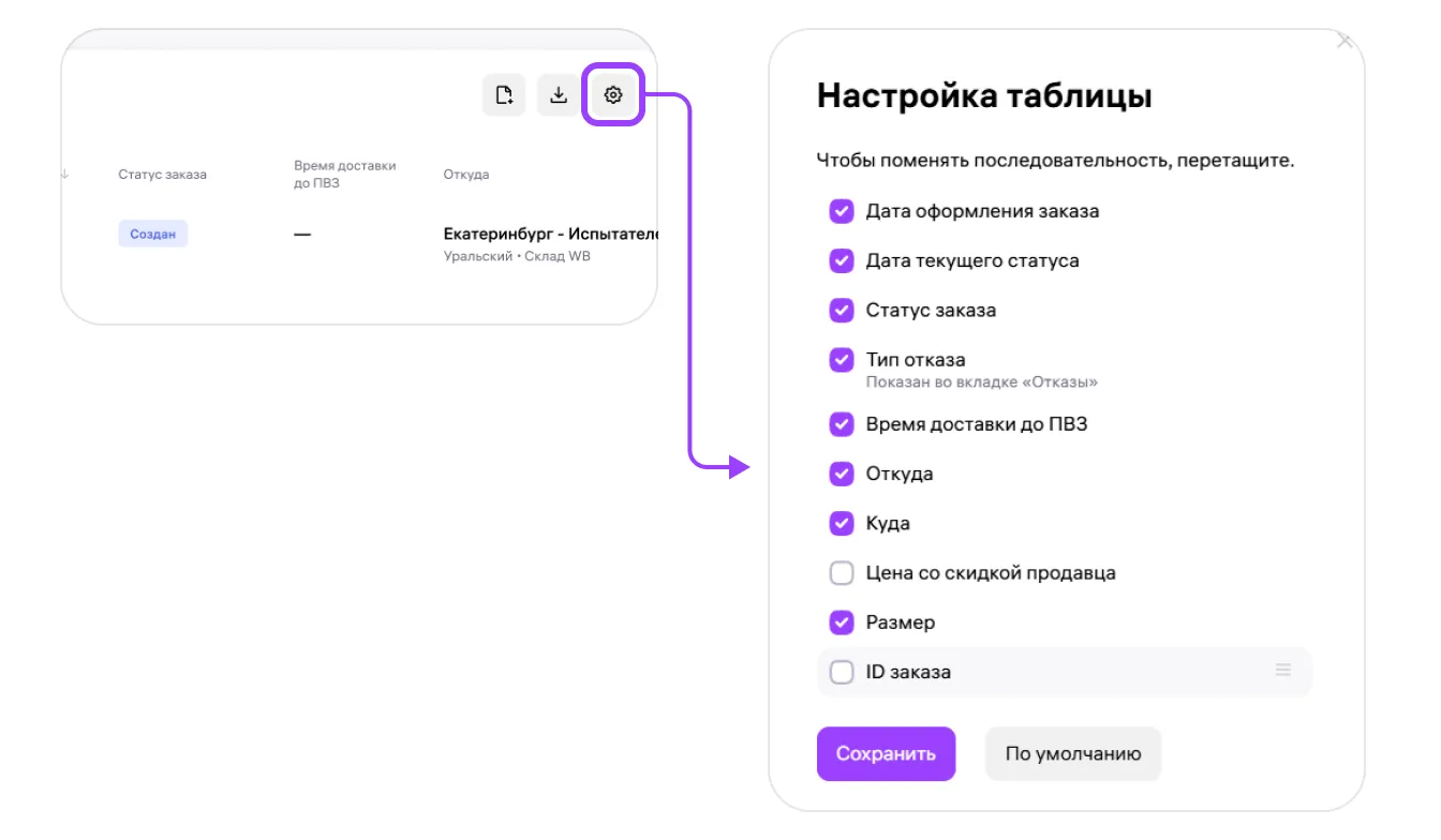 Порядок столбцов и их отображение в таблице можно настраивать. Для этого нажмите кнопку ⚙️ над таблицей, в появившемся окне настройте отображение и нажмите «Сохранить».
