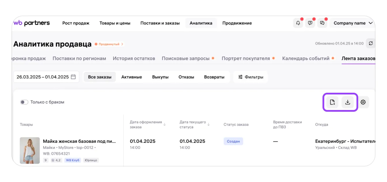 В «Ленте заказов» данные показываются по часовому поясу продавца и обновляются почти в реальном времени. Поэтому показатели в Ленте могут немного отличаться от других аналитических отчётов: здесь отображается самая свежая информация, а в остальные отчёты она может попадать с небольшой задержкой