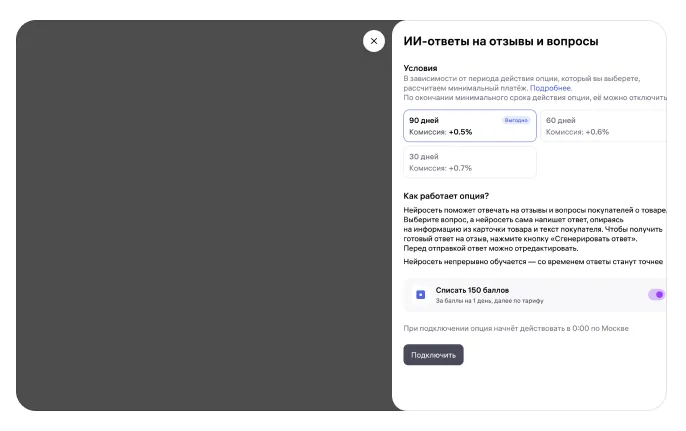 3. Если у вас достаточно баллов, их можно потратить на все дни работы опции. Например, при подключении опции на 30 дней, комиссия начнёт списываться только с 31-го дня.