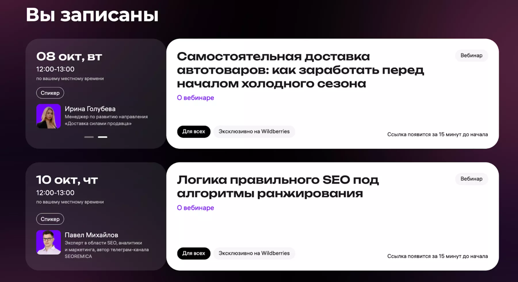 Если вы записались на вебинар, ссылка на его трансляцию появится на сайте PRO WB и на портале в разделе «Обучение» за 15 минут до начала. Также ссылка придёт в пуш-уведомлении в приложении Wildberries для покупателей.