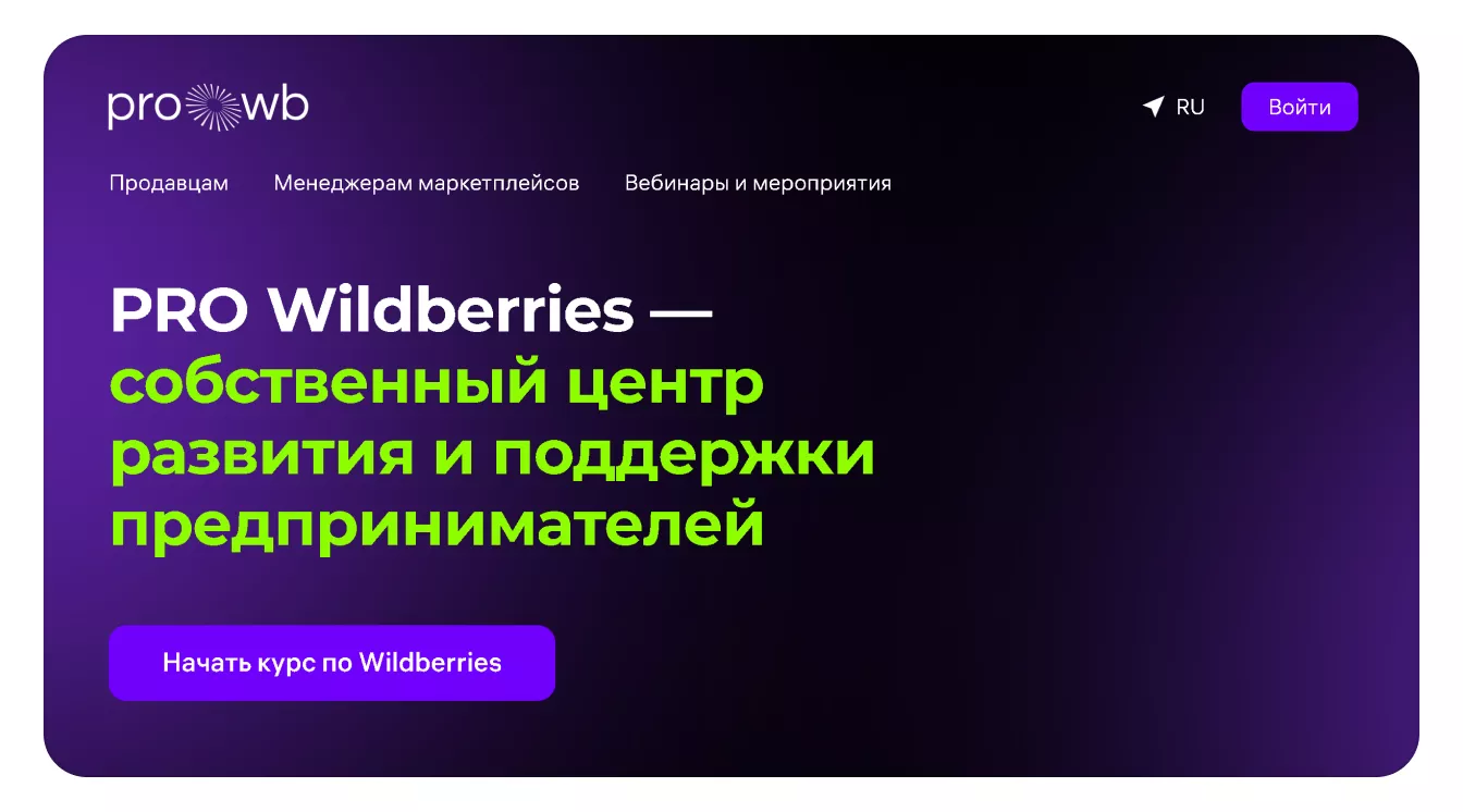 PRO Wildberries — это собственный центр развития и поддержки предпринимателей Wildberries: продавцов, менеджеров маркетплейсов и других.