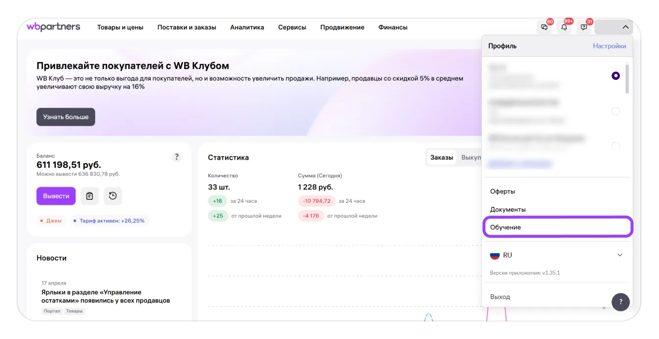 Нажмите на название вашего магазина в правом верхнем углу портала и в выпадающем окне профиля выберите раздел «Обучение».