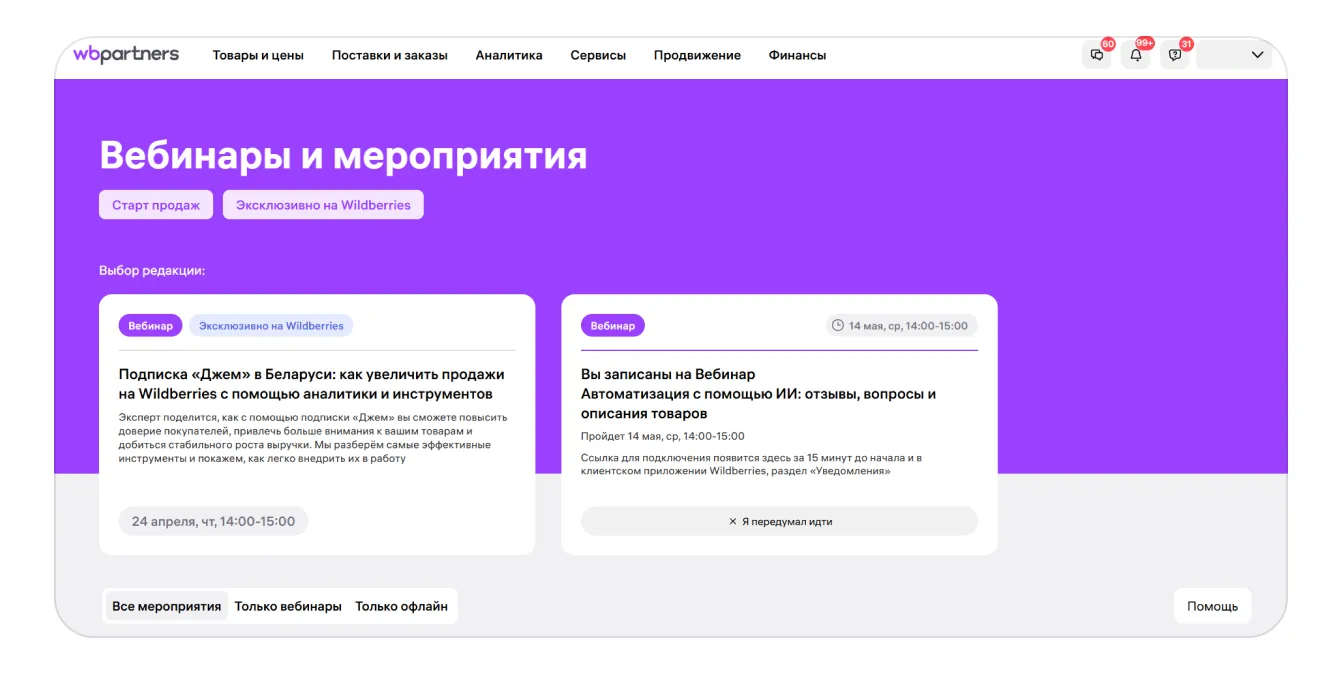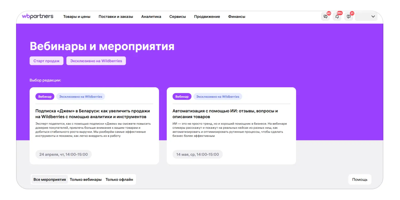 Сервис предлагает бесплатные онлайн- и офлайн-мероприятия: курсы, вебинары, лекции и мастер-классы от экспертов и топ-менеджеров Wildberries.