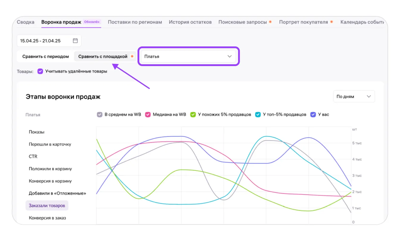 Данные в этой версии отчёта помогут оценить, как продаются ваши товары, — в сравнении с данными продаж других продавцов на Wildberries. Выберите предмет, например «Платья», — и вы увидите показатели продаж предмета по площадке и сможете сравнить свою воронку продаж с результатами других магазинов. Такой анализ помогает отслеживать рыночные тенденции, понимать, в чём вы сильнее или слабее конкурентов, и корректировать стратегию продаж.