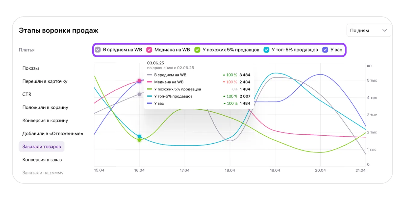 Этот виджет показывает, как продажи выбранного предмета проходят по воронке на каждом этапе — от просмотров карточек до выкупов — в сравнении с другими продавцами на площадке. Можно сопоставить свои данные сразу с несколькими группами продавцов: