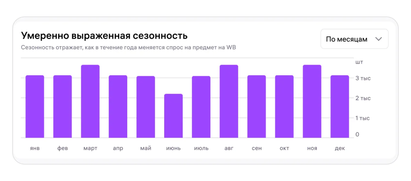 На виджете показаны изменения спроса товара за последние два года (по месяцам или неделям). Данные помогут управлять ассортиментом. Например, если в какой-то период спад продаж в категории наблюдается у всех продавцов — это сезонность, а если только у вас — возможно, стоит скорректировать стратегию продаж.