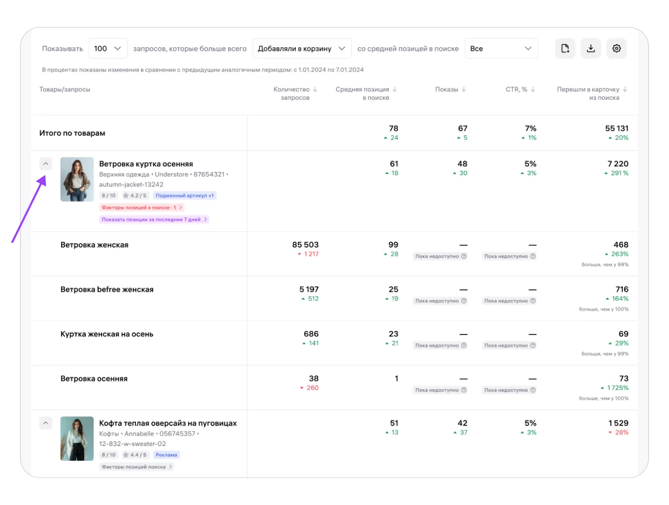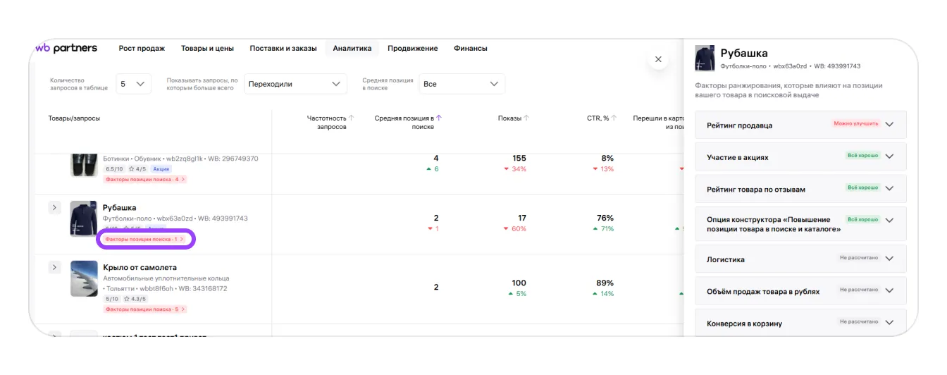 В таблице собраны данные по вашим товарам и их месту в поисковой выдаче в соотношении с товарами других продавцов. Здесь же показаны запросы, по которым покупатели находят ваши товары в поиске, факторы, которые повлияли на позицию ваших карточек, и рекомендации по улучшению позиций.