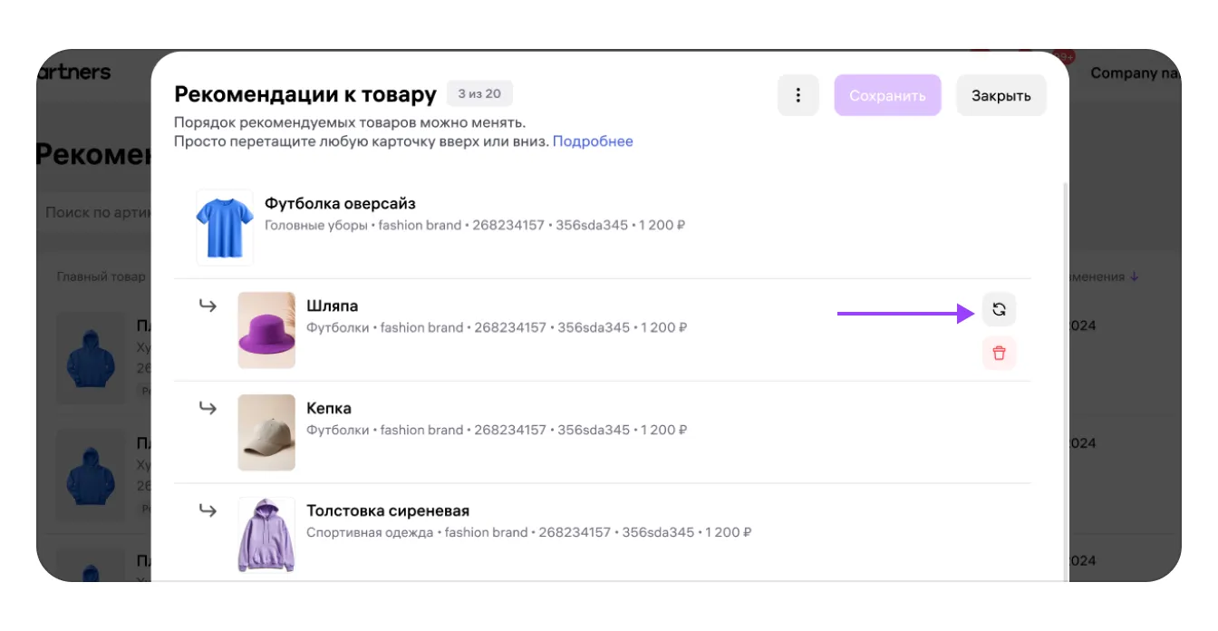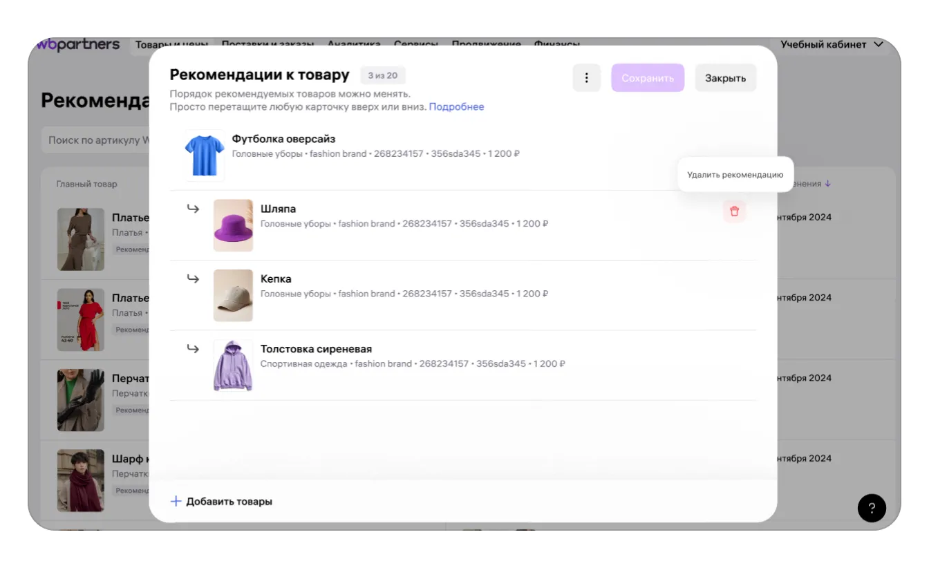Чтобы удалить отдельную рекомендацию, наведите курсор на карточку товара в списке. Появится иконка корзины — нажмите на неё. Далее подтвердите действие во всплывающем окне.