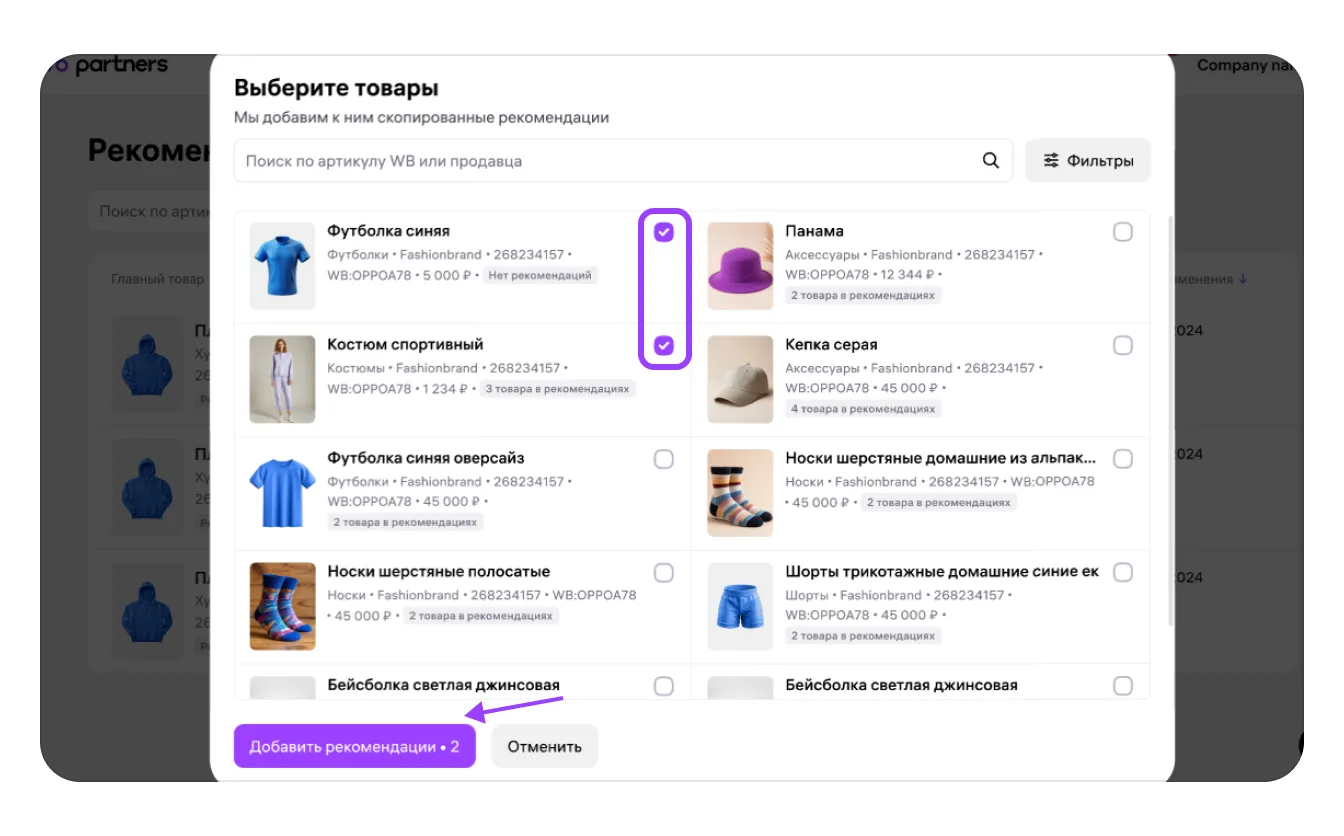 2. Откроется окно со списком товаров, к которым можно добавить скопированный набор рекомендаций. Отметьте нужные товары галочками, и после этого кнопка «Добавить рекомендации» станет активной. Можно отметить один или несколько товаров.