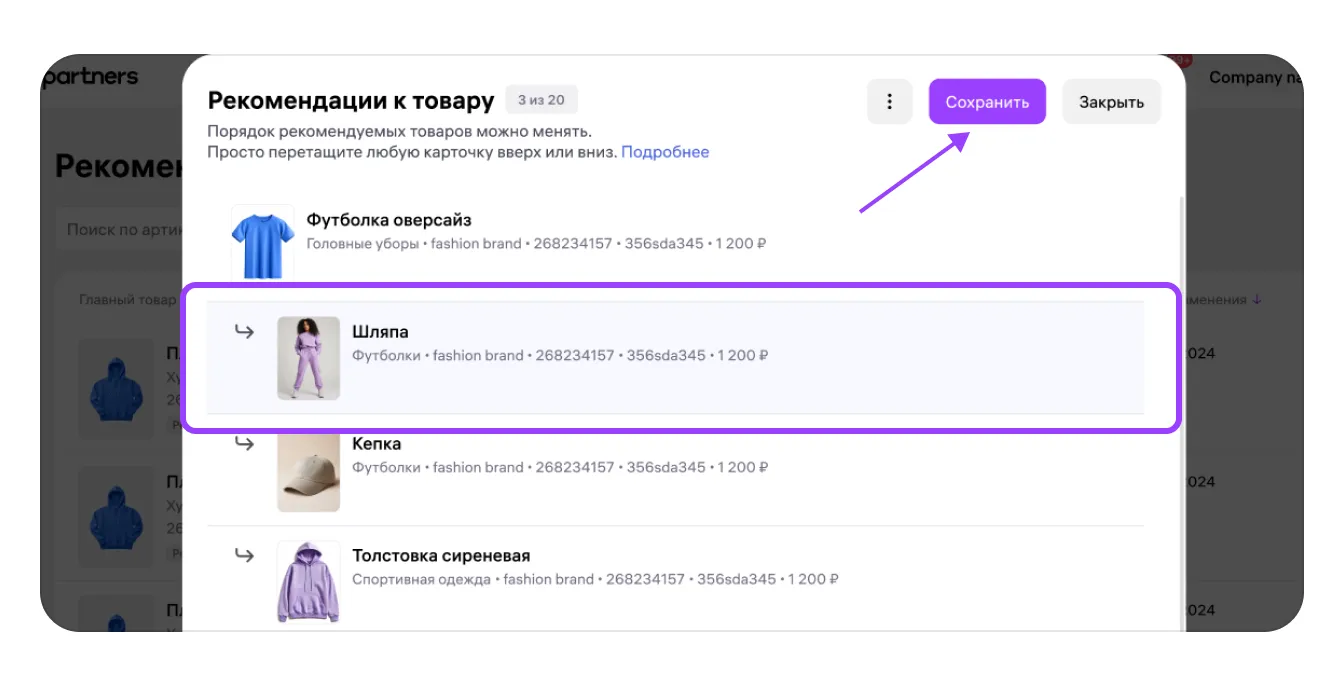 На следующем шаге новая рекомендация будет подсвечена в списке. Если всё в порядке, выберите «Сохранить» — изменения сохранятся и новый товар появится в рекомендациях к карточке.