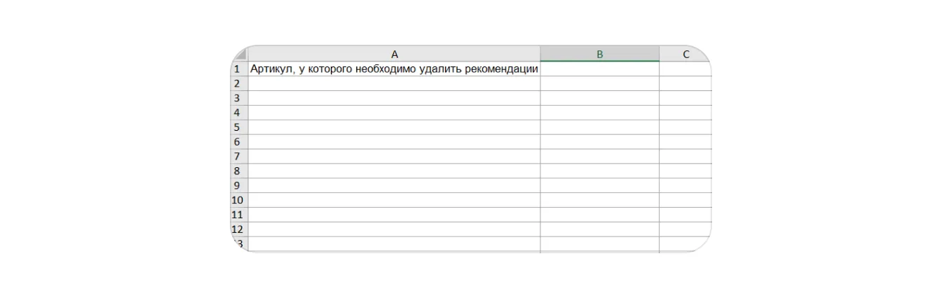 4. Заполните файл — внесите артикулы WB ваших товаров, у которых хотите удалить рекомендации.