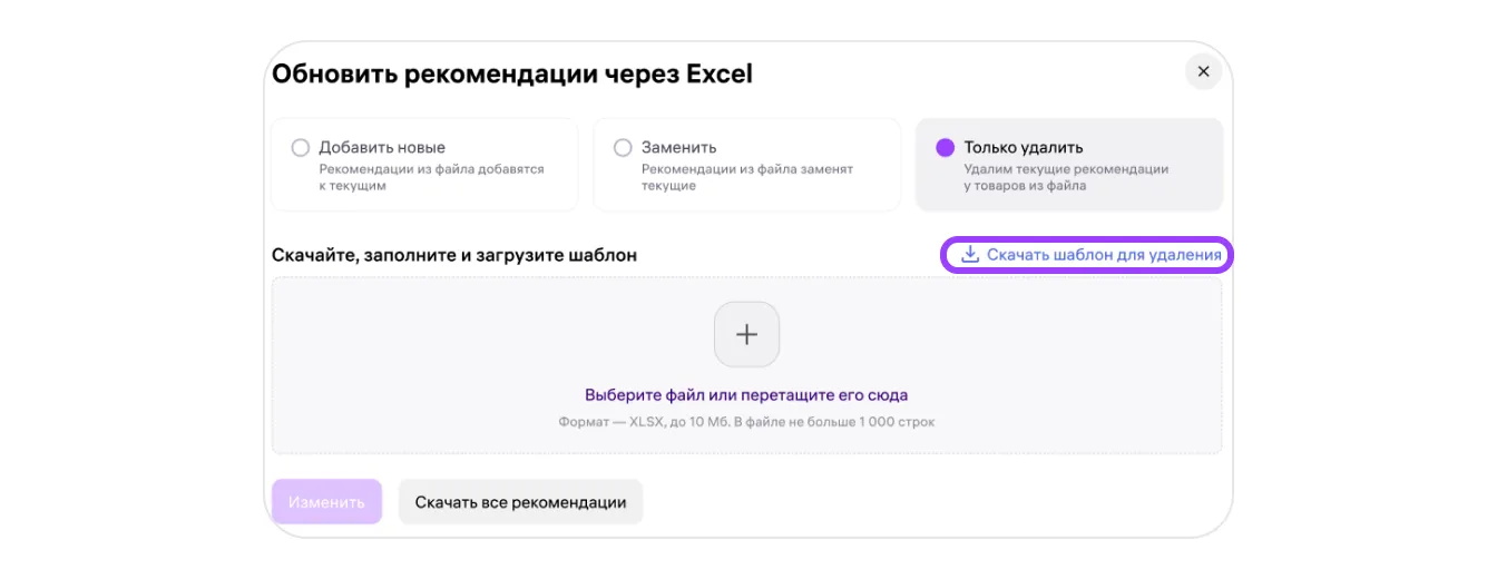 Если нужно удалить рекомендации сразу для многих карточек, используйте массовое удаление через XLSX-файл.