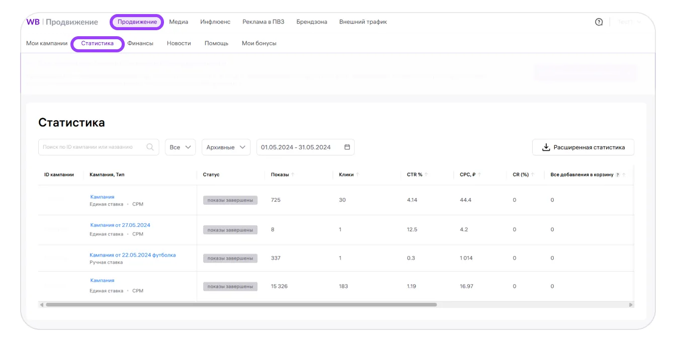 Все ваши кампании и значения их метрик отображаются на портале во вкладке «Продвижение» → WB Продвижение → Статистика.