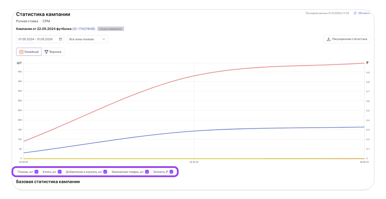В «Базовой статистике кампании» помимо метрик из общей статистики, добавляются показатели: