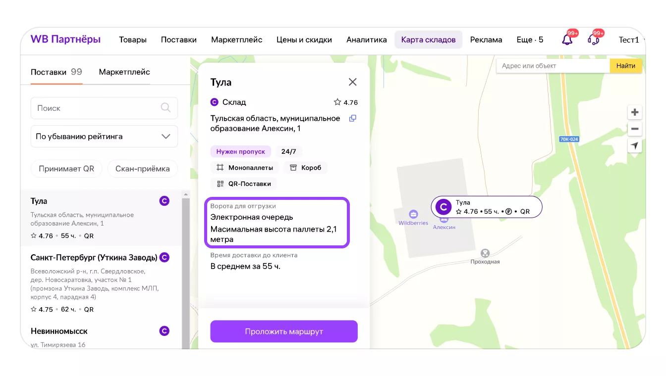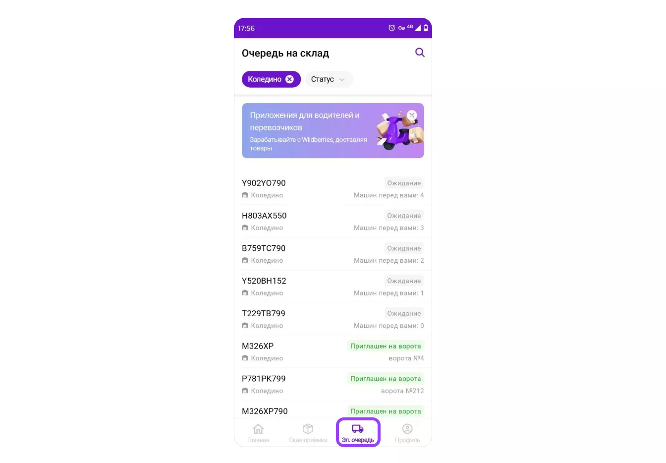На складе может быть электронная очередь. Узнать, на каких складах есть электронная очередь, можно в разделе «Карта складов». Выберите склад и посмотрите в описании пункт «Ворота для отгрузки».