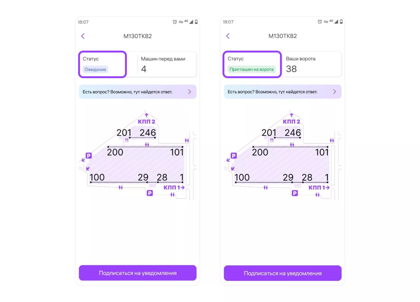 Нажмите на номер своей машины, чтобы посмотреть статус, номер ворот и куда именно ехать. Можно подписаться на уведомления, чтобы не пропустить очередь.