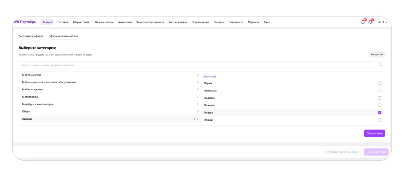 5. Если характеристики товаров не в таблице, вы можете создать её вручную. Для этого нажмите «Сформировать шаблон». Выберите категории и подкатегории, к которым относятся ваши товары. Например, можно выбрать категорию «Одежда» и подкатегории «Платья», «Комбинезоны» и «Юбки». Затем нажмите «Продолжить».