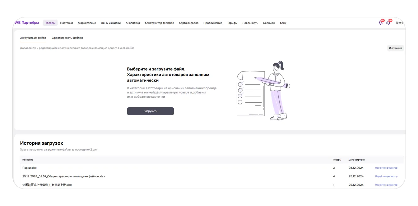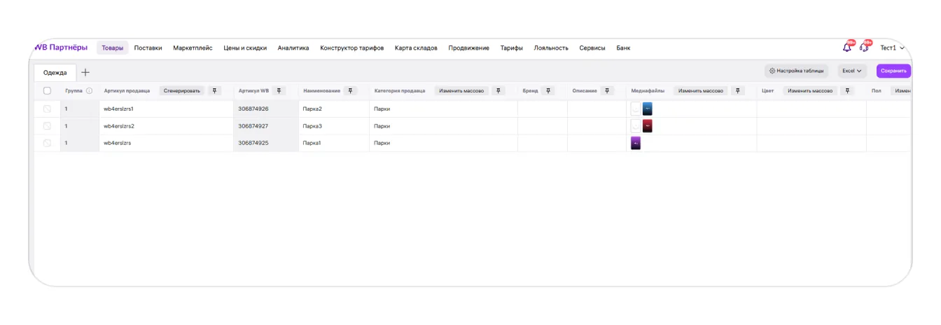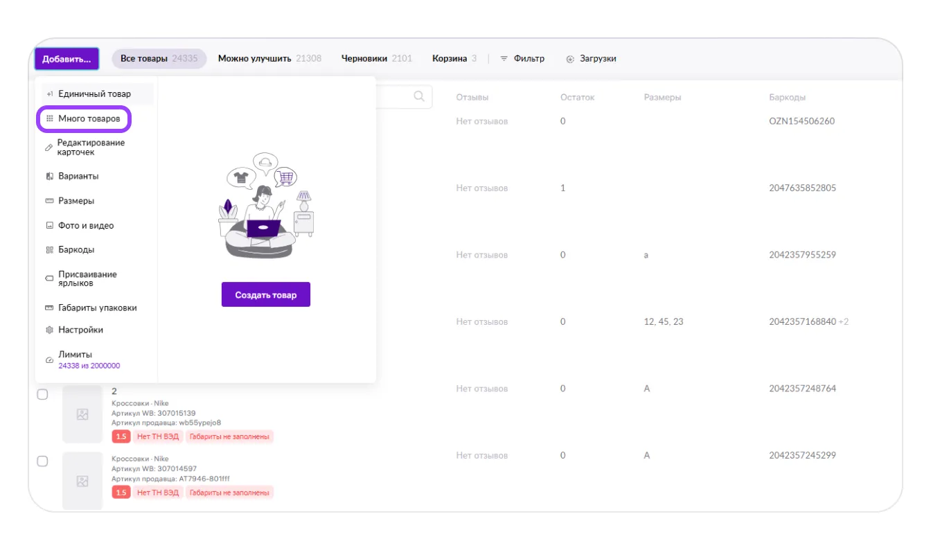 Если вы хотите выставить на продажу сразу много разных товаров, можно создать для них карточки одновременно через онлайн-редактор. С его помощью также можно редактировать характеристики своих товаров и генерировать баркоды.