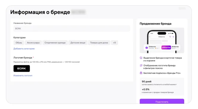 Подключить продвижение бренда вы можете бесплатно. Но каждый продавец, который захочет поучаствовать в продвижении, будет платить Wildberries 0,5% комиссии с продаж каждого товара бренда. Если вы правообладатель, который сам продаёт товары своего бренда, вы также будете платить комиссию.